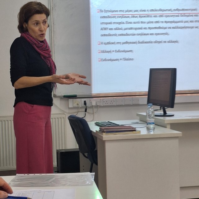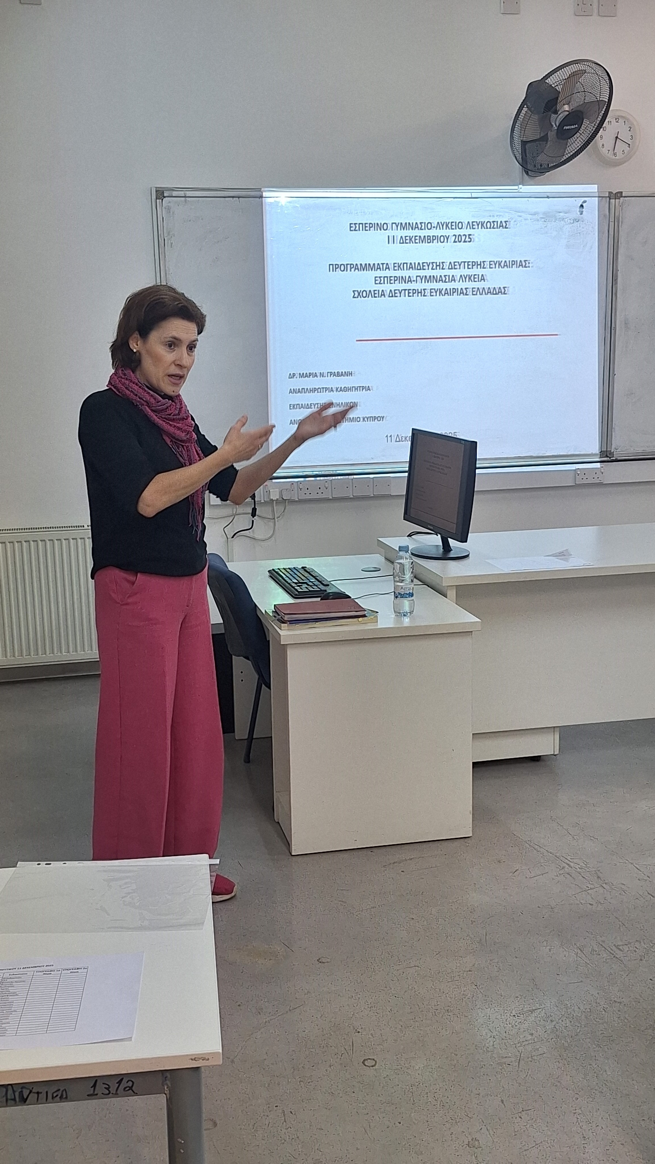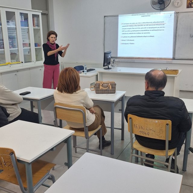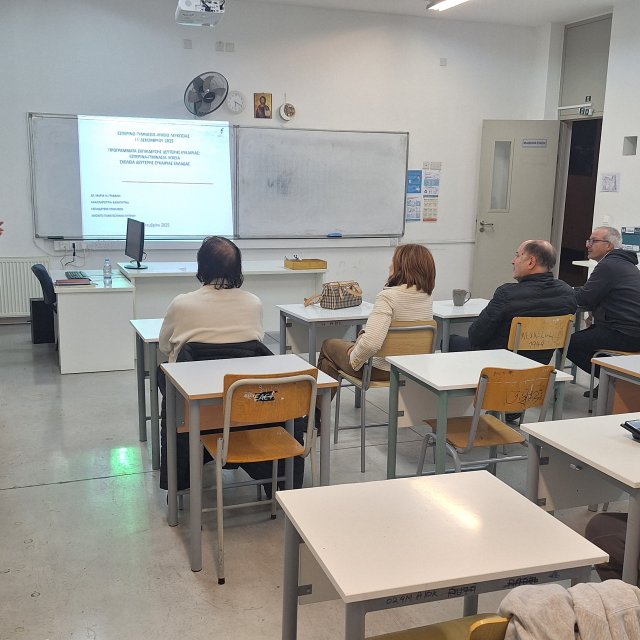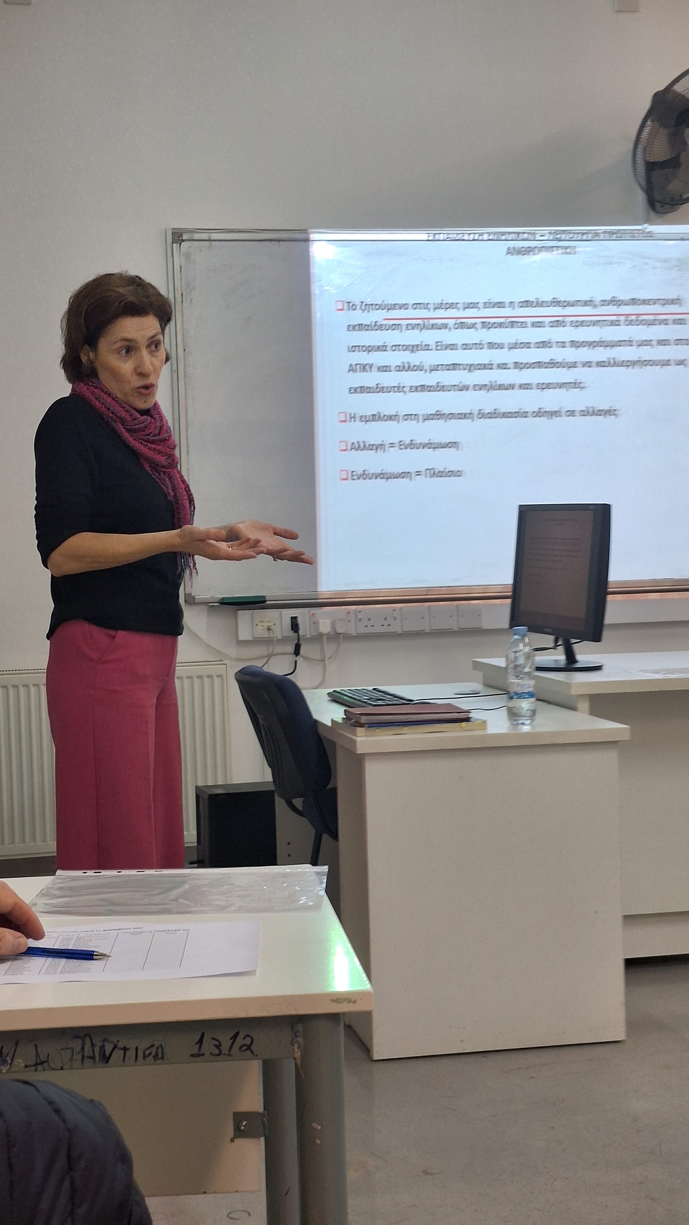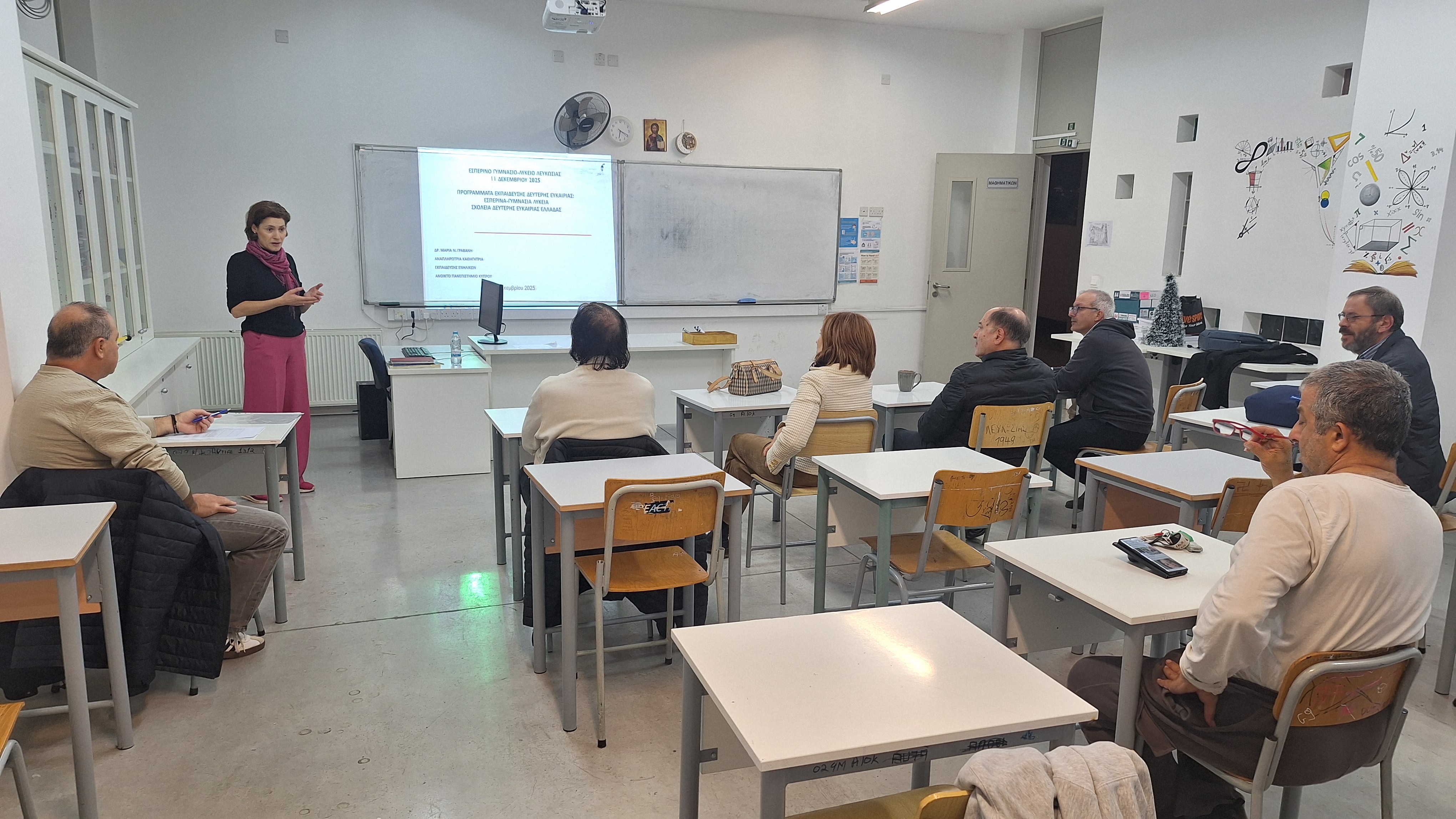 Την Πέμπτη, 11/12/2025, στο πλαίσιο επιμόρφωσης για την Ημέρα Εκπαιδευτικού, οι καθηγητές και καθηγήτριες του σχολείου μας παρακολούθησαν διαλέξεις με θέματα: Α. «Οικολογία – περιβάλλον και ρύπανση θαλασσών – Ο ρόλος της Εκπαίδευσης», από την κυρία Ξένια Λοϊζίδου και Β. «Εκπαίδευση ενηλίκων» από την καθηγήτρια Ανοιχτού Πανεπιστημίου Κύπρου κυρία Μαρία Γραβάνη.